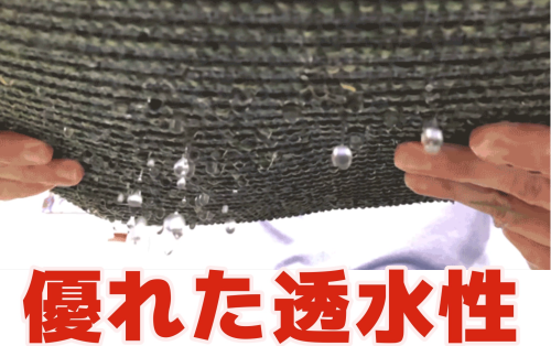 庭芝ドットコムの人工芝は抜群の透水性があります。裏面に目に見える穴はなく、独自製法により、人工芝の裏側に特殊加工が施されていて、基布のどこからでも水が抜けるようになっています。従来製品は基布に等間隔で穴を開け、そこから表面の水を逃がしていました。この水抜き穴があることで、そこから光が入り雑草が生えてくる原因にもなっていました。庭芝ドットコムの人工芝は透水性抜群で、雨が降った後でも水たまりができにくく、水はけがいいので、コケやカビも生えにくい人工芝です。また、ワンちゃんや猫ちゃんなどのペットの糞尿も洗い流すことができ、いつも清潔です。
